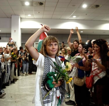 “Podría hablar durante mucho tiempo sobre los malos tratos y abusos que sufrimos durante nuestro encarcelamiento, pero esa no es la historia”, señaló Thunberg ante los medios en el aeropuerto, donde los integrantes de la Flotilla fueron recibidos por cientos de personas con banderas palestinas y pancartas contra el “genocidio”.